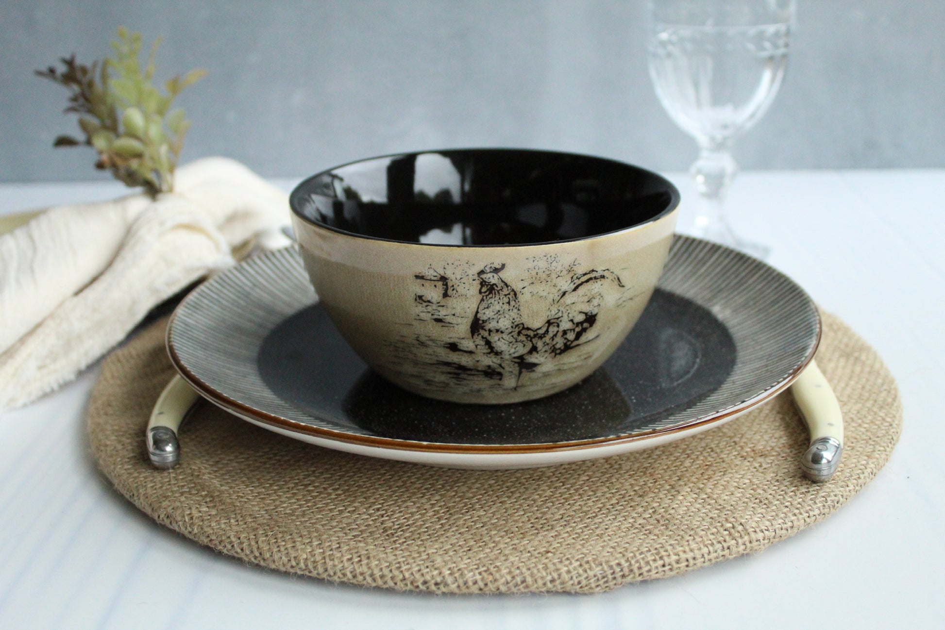 Plato de fondo negro con el borde con diseño a rayas, blanco y negro.
